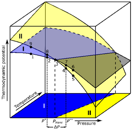Consider a multidimensional space where the thermodynamic potential is a function of different variables. In a system of constant composition, each phase can be represented as a potential-energy surface in terms of pressure and temperature. The equilibrium-transformation conditions between two phases are defined by the intersection of surfaces, corresponding to the phase-boundary lines. In the example shown in Figure 1, if an isothermal compression is considered, then one can expect that the thermodynamic potential of the system should vary along the path 1–2–3–4–5 upon compression (5–4–3–2–1 upon decompression), with the sharp transformation of the entire sample occurring at Point 3, corresponding to the pressure (Ptrans) at which the potentials of Phases I and II become equal. In practice, however, during the course of first-order transitions, the potential often follows the path 1–2–3–7–4–5 upon compression (5–4–3–8–2–1 upon decompression). Phase I, which exists for Ptrans < P < P** during compression, is not in equilibrium because it is not the minimum potential configuration but a “superpressurized” metastable state. Likewise, Phase II, which persists upon decompression for P* < P < Ptrans, corresponds to a “superdepressurized” state (named by an analogy to superheated and supercooled states). Hence, the experimental onset of the transition upon the pressure increase can be regarded as an upper bound of the metastability range, while the onset of the reverse transition marks a lower bound. The pressure range ΔP = P** − P* of this hysteresis (and the values of P* and P**) depend on many factors, such as the pressure-change rate and the purity of the substance. Moreover, note that the intervals (P**, Ptrans) and (Ptrans, P*) are not necessarily equal, and so the center of the hysteresis loop does not need to coincide with the transition pressure. Therefore, the actual value of the Ptrans is difficult, if not virtually impossible, to locate from the experiment.