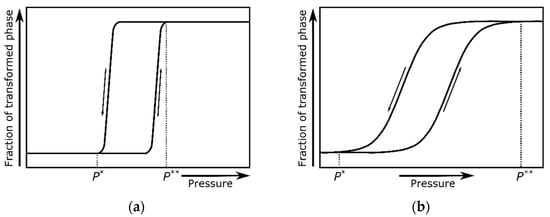Furthermore, it has to be stressed that the solid-state first-order transitions proceed through the nucleation and growth of interfaces. If the kinetics of nucleation is much slower than the rate of the pressure (or temperature) change, then one can observe the phase coexistence, where the mass fraction between the two phases changes across the transformation [16]. If the crystal structures are not similar, and the change from one structure to the other involves the significant reorganization of the bonding scheme at the atomic level, then the energy barrier of nucleation may be considerable and the transformation rate sluggish. Moreover, many other factors (such as the pressure- or temperature-variation rate, sample microstructure, or sample environment) may affect this process. Figure 2 demonstrates the fraction of the transformed phase as a function of pressure in a pressure-induced first-order transition for different kinetic rates.