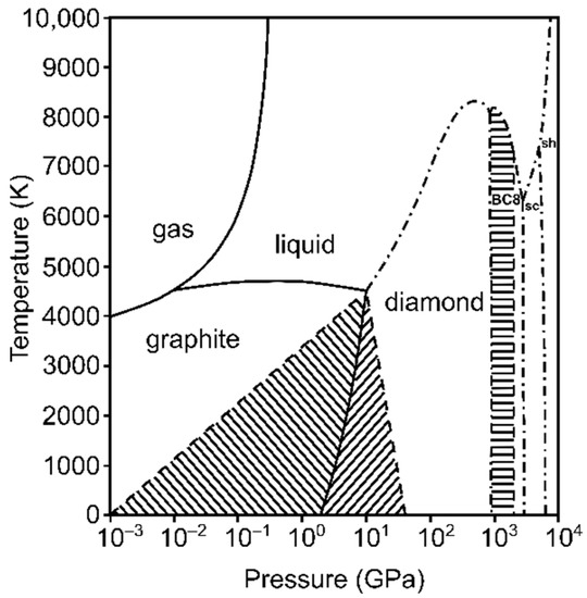 - Bundy, F.P. Pressure-temperature phase diagram of elemental carbon. Phys. A Stat. Mech. Its Appl. 1989, 156, 169–178. [Google Scholar] [CrossRef]