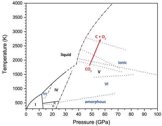 Chemical compounds exhibit a higher degree of complexity. The P–T phase diagrams are determined for all the phases with the same net stoichiometry (constant empirical formula). Even for the simplest cases, there are many contradictory results, which have stirred major controversies. One of the examples is carbon dioxide (CO2), which, despite the simple stoichiometry, has quite a complex phase diagram that consists of several crystalline molecular polymorphs below ~35 GPa. Above this pressure, in laser-heated diamond-anvil-cell experiments, they transform to a polymeric tetragonal crystal phase, which is named CO2-V, which can be described as a network of fourfold coordinated carbon atoms interconnected by oxygen bridges [49,50]. The substantial kinetic barrier that results from the reconstruction of the bonding scheme may preclude the formation of this phase, leading to the quenching of metastable states in the stability field of CO2-V. Indeed, other extended covalent (CO2-VI [51]) and even ionic (i-CO2 [52]) structures of CO2 have been suggested in experimental studies of CO2 in the nonmolecular P–T regime. Recent reports that extend the pressure range beyond 100 GPa [53] and that employ in situ high-pressure–high-temperature (HP–HT) X-ray diffraction [54] confirmed that CO2-V is the only stable modification of carbon dioxide at P > 35 GPa. Moreover, a previously reported dissociation of CO2 to elements [55,56,57] was not observed, even in long laser-heating cycles up to a pressure above 100 GPa and T = 6200 K [54]. The P–T diagram of CO2 showing the relationships between the equilibrium crystal phases and nonequilibrium states is illustrated in Figure 4. Please note that the position of the so-called kinetic transition lines may depend strongly on the pressure- and temperature-change rate and the P–T pathway.