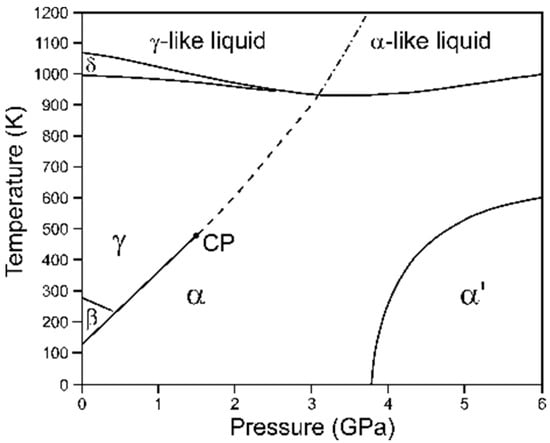 The phase diagram of cerium adapted from the literature data [86,87]. Solid traces denote the phase-boundary lines, and CP marks the critical point. The dashed line corresponds to the minimum observed in the isothermal-bulk-modulus plots [85]. The dash-dotted line refers to the liquid–liquid transition [86]. The phase denoted in the literature as α” (mC4 in Pearson notation) and claimed to coexist with α’ in part of its P–T field was not confirmed in the recent experimental study [87]. The stability of the α’ and α” structures is a matter of ongoing debate.