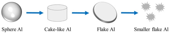 Al has good ductility when it is subjected to external force, which would deform firstly. So flake Al is usually prepared by ball milling. As shown in Figure 5, in the process of ball milling, the sphere Al is extruded and sheared by ball milling beads. Under the action of force, sphere Al is changed to cake-like, firstly. In the second stage, the caked Al continues to be subjected to force and becomes flake Al; in the third stage, the flake Al would be broken and becomes smaller flake Al. So different thicknesses of flake Al can be prepared by controlling the parameters of ball milling.