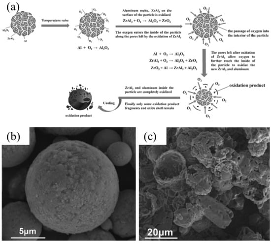 The oxidation process of Al-Zr alloy (a), Al-W alloy (b) and Al-W alloy after combustion (c), reprinted/adapted with permission from Refs. [53,54]. 2019 and 2021, Ai-min Pang and Shuizhou Cai.