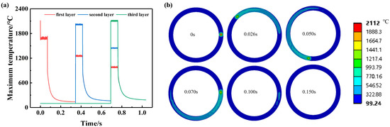 - Ring scanning simulation gives the maximum temperature fluctuated within a very small temperature range after the laser scanning began. The maximum temperature gradually increases and then tends to be stable with the increase of layers. The temperature gradient is greatest along the building direction.