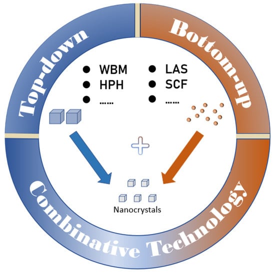 Nanocrystals are generated by reducing particle size (top-down technology), growing particles in the nanometer size range (bottom-up technology), and combining these two technologies [22].