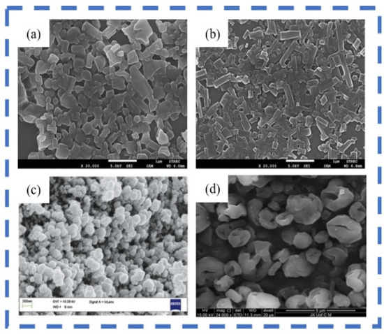 (a,b) SEM micrographs of clarithromycin nanocrystals obtained by media milling method; (c) SEM micrographs of carvedilol nanosuspensions using the antisolvent precipitation-ultrasonication method; (d) Transform Breviscapine (BVC) nanocrystals into BVC nanocrystals embedded microparticles (BVC-NEP) via spray-drying, adding matrix formers Maltodextrin. Figure 3a,b were reprinted from ref. [76] with permission from Elsevier, Copyright® 2018. Figure 3c was reprinted from ref. [70] with permission from Springer Nature, Copyright® 2012. Figure 3d was reprinted from ref. [77] with permission from Elsevier, Copyright® 2021.