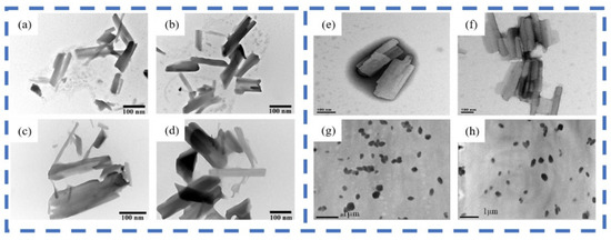 Breviscapine (BVC) nanocrystals modified by d-Tocopherol acid polyethylene glycol 1000 succinate (TPGS) at different concentrations. (a) BVC-NC/@5%TPGS, (b) BVC-NC/@10%TPGS, (c) BVC-NC/@20%TPGS, (d) BVC-NC/@30%TPGS; (e,f) 10-Hydroxycamptothecin nanocrystals; (g,h) TEM of the resveratrol nanocrystals. Figure 4a–d were reprinted from ref. [77] with permission from Elsevier, Copyright® 2021. Figure 4e,f were reprinted from ref. [78] with permission from Elsevier, Copyright® 2021. Figure 4g,h were reprinted from ref. [79] with permission from Elsevier, Copyright® 2022.