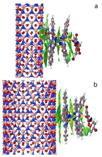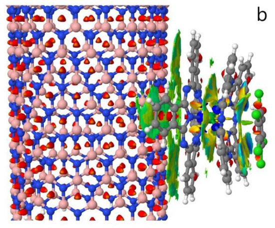 By examining the LnPc2 decoration on the surface of the zigzag (9,0) and (18,0) boron nitride nanotubes (BN90 and BN180), we found that the color was mainly yellow and green, indicating that the force was weak. Due to the larger and flatter surface of the BN180 nanotubes, the area of non-covalent interaction was significantly larger than that of the BN90 nanotubes after LnPc2 decoration. Dispersion interactions between the outer aromatic rings of Pc led to an optimized geometry of a convex Pc structure. The results estimated by B3LYP-D (DFT-D) in [52] suggested the importance of the dispersion interactions for the structure of a Pc dimer. After the adsorption of the compounds, more blue regions were apparent between the LnPc2 complex and the pentachlorophenol (pcp), while 6-OH-BDE-47 (6ohbde47) lacked blue regions and had more repellent yellow-red areas. From the perspective of molecular morphology, phthalocyanines generally adsorb with the molecular plane parallel to the surface [53], indicating that pcp was adsorbed on the complex more stably due to its aromatic planar state (Figure 1 and Figure 2). In addition, a light blue area appeared between the complex and the chlorine atom of pcp and the bromine atom of 6ohbde47. This was because halogen atoms have more non-bonded electrons than other atoms.