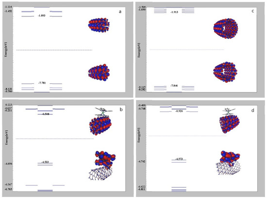 Energy level diagrams and frontier molecular orbitals (HOMO and LUMO): (a) zigzag (9,0) boron nitride nanotubes and (b) zigzag (9,0) boron nitride nanotubes decorated with YbPc2 complex; (c) zigzag (18,0) boron nitride nanotubes and (d) zigzag (18,0) boron nitride nanotubes decorated with YbPc2 complex.
