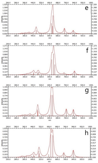 Electronic excitation spectra: (a) CePc2, (b) zigzag (9,0) boron nitride nanotubes decorated with CePc2 complex, (c) EuPc2, (d) zigzag (9,0) boron nitride nanotubes decorated with EuPc2 complex, (e) TbPc2, (f) zigzag (9,0) boron nitride nanotubes decorated with TbPc2 complex, (g) YbPc2, and (h) zigzag (9,0) boron nitride nanotubes decorated with YbPc2 complex.