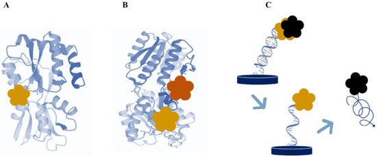 (A) First configuration: Fluorophore labeled to a strategic site of the biocomponent to sense changes in the microenvironment due to variations in its conformation. (B) Second configuration: Donor/acceptor pair of fluorophores labeled to selected sites of the biocomponent (Förster resonance energy transfer, FRET). (C) Third configuration: Fluorophore–quencher pair to provide electron transfer-based fluorescence quenching.