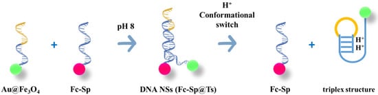 Electrochemical-based switch biosensing involves electroactive mediators, attached to a specific site of the biocomponent immobilized onto an interrogating electrode, which produces redox currents. Changes in the biocomponent conformation, induced by the binding event, hamper the mediator to reach the electrode surface, thus varying the redox currents that can be recorded by electrochemical transductions [7,8]. A crucial example of such fine configuration is described by Zhao and colleagues [9], in which a biosensor was constructed to analyze the Nosema bombycis gene DNA (PTP1) by recording PTP1-based LAMP (loop-mediated isothermal amplification), transducing the chemical stimuli H+ into a ferrocene electrochemical signal. The biosensing principles rely on the ability of H+ to induce a conformational switch of DNA nanostructure, assembled by the ferrocene-labeled signal probe and DNA-based receptor hybridization, and it is responsive to pH. In detail, as the pH decreases, this DNA-based receptor undergoes a structural variation and changes into a stable triplex, causing the release of the ferrocene-labeled signal probe and thus generating amplified electrochemical signals (Figure 2).