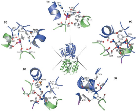 Diversification of ligand binding to RBP by computational design. RBP bound to (a) Dihydroxyacetone phosphate (DHAP) with a Kd = 3 μM; (b) pinacolyl methyl phosphonic acid (PMPA), a non-toxic surrogate for the nerve agent soman, with a Kd = 70 nM; (c) l-lactate with a Kd = 7 μM; (d) Zn(II), with a Kd = 2.5 μM; (e) trinitrotoluene (TNT), an explosive, with a Kd = 2 nM. Reprinted with permission from [24] Copyright (2022) Elsevier.