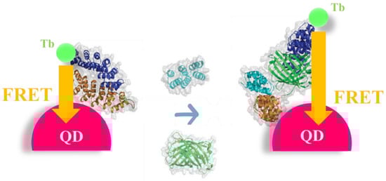 Besides proteins, artificial scaffold proteins have been also described in the literature as switch probes, overcoming the main limitations of antibodies arising from their size, stability, and structure complexity. For example, Leger et al. [34] described the development of two bidomain artificial proteins (αRep) for the design of a FRET-based biosensor. In detail, such bidomains were labeled with a Tb complex (Tb) donor on the C-terminus and a semiconductor quantum dot (QD) acceptor on the N-terminus, to quantify different protein targets at sub-nanomolar concentrations. In the absence of the targets, the bidomains are in a “closed” conformation, with domains facing each other. In the presence of the target, the bidomains switch to an “open” conformation, which can be detected by time-resolved FRET (Figure 4). This FRET biosensor was able to achieve sub-nanomolar detection limits in phosphate-buffered saline and low nanomolar ones in serum-containing samples.