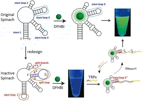 Zhou et al. [45] described the redesign of an RNA aptamer from Spinach for the conformational switch-based fluorescence detection of telomerase activity, as research on the activity and inhibition of telomerase is crucial for cancer diagnosis and therapy. This redesigned aptamer has an extended 5′ end and arranges as an inactive structure not able to interact with 5-difluoro-4-hydroxybenzylidene-imidazolinone (DFHBI) fluorophore. In detail, the stem loop 3 was split into two arms, where the new extended 5′-end fold into a new hairpin structure (a/b/a*), thus preventing hybridization with the split branch on the 3′ end (a**). When telomerase is present, a telomerase substrate primer likewise extended to the 3′ end with (TTAGGG)n repeats can hybridize with the inactive redesigned aptamer, which folds into an active conformation (Figure 5). This structure switch allowed for the monitoring of telomerase activity from 100 to 5 × 104 Hela cells with a detection limit of 100 cells, furnishing a valid tool for the evaluation of the differentiation of cancer cell lines from normal cell lines as well as of the inhibition efficiency of telomere-binding ligands, crucial for telomerase-related cancer diagnosis and therapy.