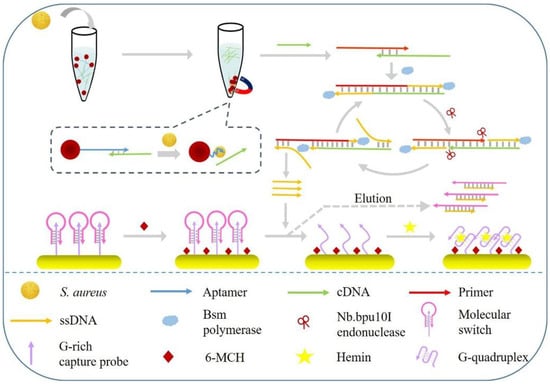 More recently, a triple-helix aptamer switch was proposed to reveal Staphylococcus aureus, combined with a signal amplification system to increase the sensitivity [48]. In detail, Bsm DNA polymerase and Nb.bpu10I endonuclease were provided for the target amplification of single-strand DNA fragments. These were able to interact with the molecular switch, causing the dissociation of the triple-helix DNA structure on the electrode and thus forming an electroactive G-quadruplex/hemin complex that turns on the generation of electrochemical signals (Figure 6). This configuration enabled the detection of S. aureus in standard solution with a detection limit of 8 CFU/mL as well as in lake water, tap water, and honey samples.