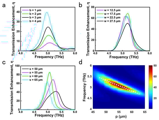 Variation of the transmission enhancement spectra as a function of structural parameters of grooves. (a) Effect of the groove depth on the transmission enhancement of the HIHB structure (w = 30 µm, s = 55 µm, p = 60 µm, N = 5); (b) effect of the groove width on the transmission enhancement of the modified structure (b = 4 µm, s = 55 µm, p = 60 µm, N = 5); (c) effect of the distance from the aperture to the first groove on the transmission enhancement of the modified structure (b = 4 µm, w = 17.5 µm, p = 60 µm, N = 5); (d) the color map of transmission enhancement spectra for the HIHB structure (b = 4 µm, w = 17.5 µm, s = 60 µm, N = 5) with different groove period p.