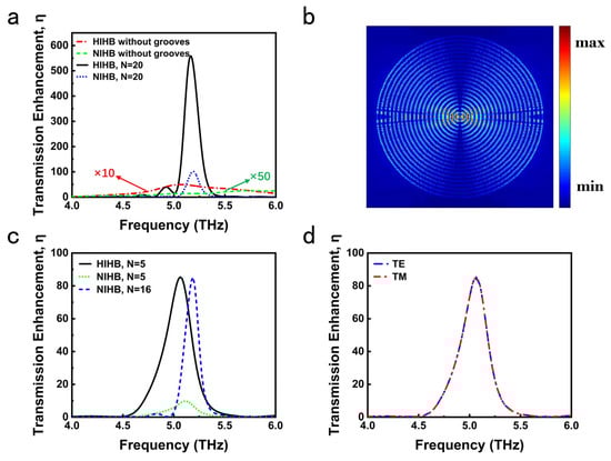 Figure 3a shows the transmission enhancement spectra comparison among the HIHB structure, the NIHB structure and the two structures without grooves. It is observed that the structure with concentric grooves has much greater transmission enhancement than that of only a single hole. The normalized-to-area transmission of grooved structure is much higher than 1, so the direct transmission of incident light plays a minor role. As shown in Figure 3b, it is the periodic grooves that can harvest a wide range of light and then squeeze the light into the central hole that results in a dramatic increase in normalized-to-area transmission. The transmission enhancement peak of the 20-groove HIHB structure is 556, and the maximum transmission enhancement of HIHB structure is more than 5.5 times that of NIHB structure. In addition, the hole diameter of the conventional bull’s eye structure is usually half of the resonance wavelength [38], which limits its response speed when used as a photodetector [39]. The HIHB structure can reduce the diameter of central hole down to 18 µm for an operating wavelength of 58 µm, as shown in Figure 3a. As shown in Figure 3c, the HIHB structure with 5 grooves is sufficient to achieve the same transmission enhancement as the NIHB structure with 16 grooves. Therefore, the entire grating size can be reduced greatly while maintaining the same light transmission performance as the conventional bull’s eye structure. The reason why the blue curve blueshifts relative to the black curve will be discussed in Section 3.3.2. Moreover, the transmission enhancement of HIHB structure is significantly higher than that of NIHB structure at N = 5. As shown in Figure 3d, transmission enhancement spectra of transverse electric (TE) and transverse magnetic (TM) polarized waves are numerically obtained. The transmission enhancement curves in both polarization directions almost coincide, implying that the HIHB structure is polarization-insensitive.