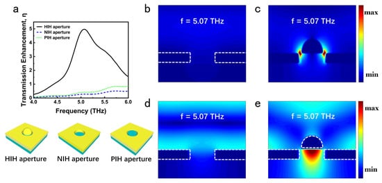 Figure 4 presents the transmission enhancement spectra for three types of single aperture without grooves and the distributions of electric and magnetic fields near the hole at 5.07 THz. The schematic representations of HIH aperture, NIH aperture, and PIH aperture are illustrated in Figure 4a. The transmission enhancement spectra in Figure 4a shows the corresponding normalized-to-area transmission results for three different samples with equivalent aperture diameter (D = 18 µm). The difference in transmission enhancement between green and blue curves is much gentler, compared with that of the black curve. A little difference between them is due to the dielectric environment changing resulted from the introduction of supporting column in pillar-in-hole (PIH) aperture. As shown in Figure 4a, a resonance peak cannot be excited by the NIH aperture within the studied frequency region and only 0.28 normalized transmission is achieved at 5.07 THz. It can be seen from the electric field distribution in Figure 4b that resonance intensity located around the hole is weak. Meanwhile, the magnetic field is mainly distributed on the upper surface of gold film, as shown in Figure 4d. Only a little electromagnetic energy can penetrate the single aperture, as a result, the transmission enhancement is small. Figure 4a shows that the enhanced transmission for HIH aperture is 4.97 at a resonance frequency of 5.07 THz. The electric field distribution in Figure 4c shows that strong resonance is generated in the gap between the aperture and the hemisphere. This demonstrates the formation of LSPRs mode, which leads to the enhancement of transmission. As can be observed in Figure 4e, the strong magnetic field is confined at the bottom of the hemisphere, illustrating that the energy is strongly coupled into the hole. The hemisphere particle can excite LSPRs mode and thus significantly improve the normalized-to-area transmission of HIHB structure.