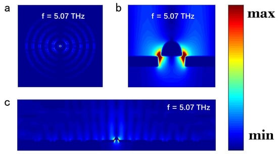 The surface plasmon polariton wavelength on a gold film surface is [45], where λ is the wavelength of incident light. The parameters and represent the relative permittivity of gold and air, respectively. According to Bragg coupling condition [46], the resonant wavelength of SPPs is theoretically equal to the groove period p. In fact, p is slightly smaller than due to the interaction between the field and the grooves that enlarges the optical path of the SPPs [19]. tends to approach p as more grooves are added to the bull’s eye structure [19]. This is why the transmission enhancement peak of 16-groove NIHB structure blueshifts relative to that of 5-groove HIHB structure in Figure 3c. When the resonances of both SPPs and LSPRs occur at the same frequency, the strong interaction between these two modes gives rise to the enhancement of transmission [47]. According to Section 3.3.1., the frequency of LSPRs mode excited by the hemispheric particle is 5.07 THz. Therefore, the period of grooves is set to 55 µm to excite the SPPs mode at the same resonant frequency as the LSPRs mode. Figure 5 shows the relative electric field intensity distributions of the optimal HIHB structure with five grooves at f = 5.07 THz. It is observed in Figure 5a,c that the HIHB structure has a significant light concentration performance resulting from periodic grooves, which is the same with conventional bull’s eye structure. As shown in Figure 5b, there exists a strong electric field distribution in the gap between aperture and hemisphere. It displays the coupling of the SPPs mode and the LSPRs mode, which further enhances the light transmission. The interaction between hemisphere and grooves can be controlled by the distance from the central aperture to its nearest groove. At non-resonant frequencies, the electric field intensity of HIHB structure and HIH aperture is weak, indicating that SPPs mode and LSPRs mode are weak. Therefore, the HIHB structure at non-resonant frequencies has a poor ability to converge light or assist light transmission.