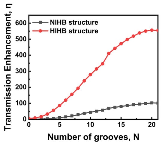 The number of grooves is increased from 0 to 21 on the basis of the optimized groove geometric parameters described above. Figure 6 shows the transmission enhancement peak as a function of the number of grooves N. When N > 7, the transmission enhancement peak of HIHB structure is around six times that of NIHB structure. In the range of N ≤ 7, which is more promising for applications, the transmission enhancement peak of HIHB structure exceeds that of NIHB structure by a factor of 7. As N increases, the transmission enhancement peak gradually increases because an extending range of incident light can be collected with increasing number of grooves. The transmission enhancement of the HIHB structure reaches saturation at N = 20, which is similar as that of NIHB structure. If grooves are continued to be added, the captured light would be re-irradiated and the propagation loss of SPPs increases gradually [48]. As pointed out in the reference [49], varying the groove width and groove depth can increase the number of grooves involved in transmission enhancement. Therefore, it is justified to speculate that changing the geometric parameters of the outermost groove can change the corresponding N at saturation, which is applicable to both HIHB and NIHB structures.