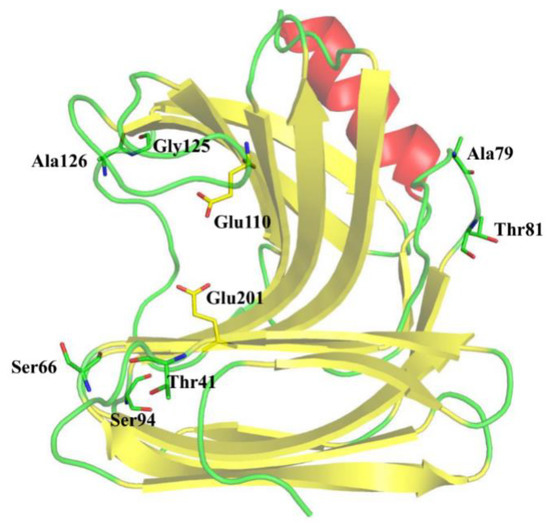 Based on the model of the wild-type XynASP, the FireProt web server predicted the thermal stability-related sites from the energy and evolution strategy; eighteen mutant sites were obtained, respectively (Supplementary Material, Table S1). Among them are seven mutant sites, Thr41, Ser66, Ala79, Thr81, Ser94, Ala125 and Gly126, located in the loop region of wild-type XynASP (Figure 1). According to the principle that the lower the folding free energy (ΔΔGfold), the more stable the structure is [30], three predicted sites with the smallest FoldX values, namely T41V, A79Y and T81Q, were selected based on the change of folding free energy of single mutants.
