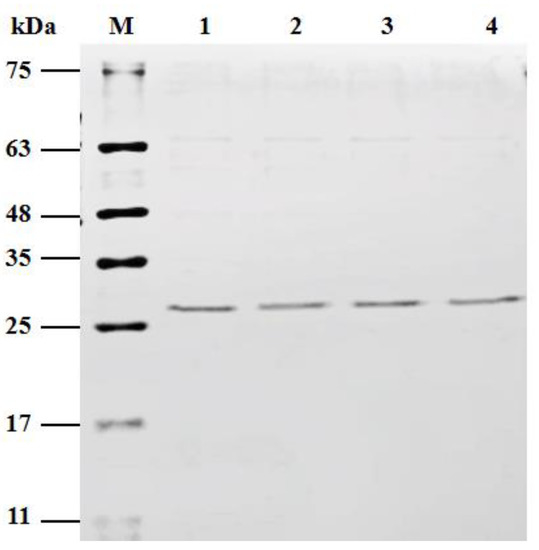 Based on the FireProt web server, mutants were constructed by site-directed mutagenesis. The recombinant xylanases were expressed into E.coli BL21(DE3) and purified to electrophoretic homogeneity as delineated already. Every single mutant and the wild-type XynASP exhibited similar molecular mass (~27 kDa) by SDS-PAGE (Figure 2).