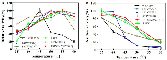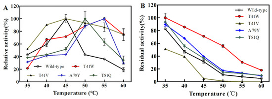 Optimal temperature (A) and thermostability (B) of the wild-type XynASP and four single mutants. The data for the wild-type and T41W was adapted with permission from Ref. [28]. 2022, Bio Tech System. The highest activity of each wild-type and mutant was set as 100%.