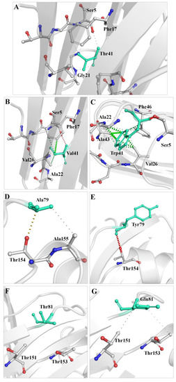 Intramolecular interactions of wild-type (A,D,F) and single mutants (B,C,E,G) residues predicted by DynaMut web server. The cyan stick modes show mutated residues. The color of each interaction type is defined as follows: green represents hydrophobic contacts; orange represents weak hydrogen bonds; red represents hydrogen bonds; yellow represents ionic interactions.