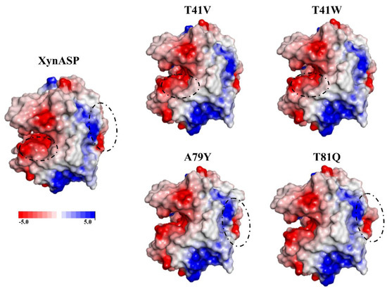 Electrostatic properties of the wild-type XynASP and single mutants. The electrostatic potential surface of enzymes calculated by Discovery Studio 3.0 was shown using the PyMOL. The black dotted ring on the wild-type XynASP and single four mutants represent the region of mutated sites.