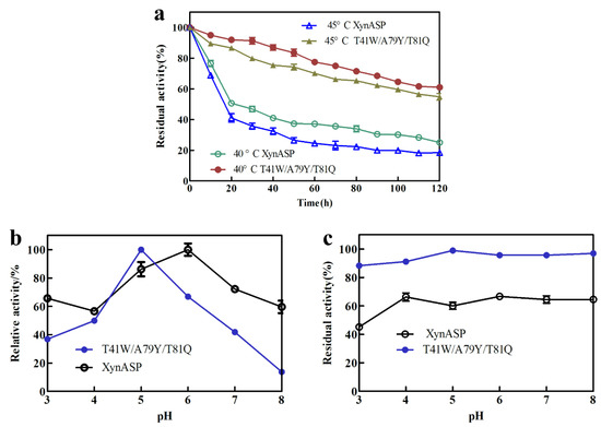 All the combined mutants exhibited high thermostability compared to that of the wild-type. Among them, the triple mutant T41W/A79Y/T81Q exhibited the highest thermal stability. To further explore the thermostability of three-site mutates, residual activities of T41W/A79Y/T81Q and wild-type thermostability were evaluated after incubating at 40 °C and 45 °C for 2 h (Figure 7a). It was found that the mutant T41W/A79Y/T81Q showed greater residual activity than the wild-type XynASP. After 2 h of incubation at 40 °C, T41W/A79Y/T81Q retained 60.9% activity, while the wild-type was inactivated rapidly and remained at 25.1% activity. Specifically, T41W/A79Y/T81Q retained more than 50% activity after incubation for 2 h at 45 °C, whereas the residual activity of the wild-type decreased rapidly and lost more than 80% of the original activity within 2 h. The half-lives of thermal inactivation (t1/2)were estimated at 40 °C and 45 °C. The half-life of T41W/A79Y/T81Q at 40 °C was evaluated to be 177.8 min, 4.7-fold higher than that of wild-type (37.8 min). The half-life of T41W/A79Y/T81Q at 45 °C also represented an impressive result, which was enhanced from 20.7 min to 127.0 min, a 6.1-fold increase over the wild-type. After exploring the thermostability of the mutant T41W/A79Y/T81Q, the pH effect of T41W/A79Y/T81Q on the activity at various pH (from3.0 to 8.0) was checked (Figure 7b). Compared to the wild-type, the optimal pH of T41W/A79Y/T81Q showed a slight change, which declined from 6.0 to 5.0, and more than 50% of activity was observed at a pH range between 4.0 and 6.5. According to the pH stability assays, T41W/A79Y/T81Q showed a significant improvement after incubation 1 h at 35 °C, which displayed more than 88% residual activities at pH 3.0–8.0. Whereas the residual activities of wild-type were distributed in 40–70% at the same pH condition (Figure 7c). These results indicate that T41W/A79Y/T81Q has more pH resistance than the wild-type.