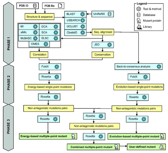 Workflow of FireProt strategy. FireProt server provides three distinct strategies: (i) evolution-based approach, utilizing back-to-consensus analysis; (ii) energy-based approach, using conservation, correlation and energy information and (iii) combined approach.Reprinted with permission from Ref. [23]. 2017, Oxford University Press.