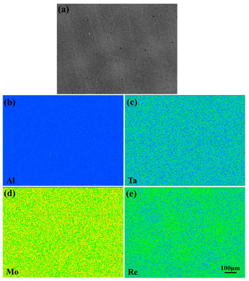 The as-cast microstructure is shown in Figure 1. It has a distinct “cross-flowered” dendritic structure arranged in the same direction, and no obvious grain boundaries are observed after macro-etching using optical microscope (OM), as shown in Figure 1a, which means that it was a single crystal structure. The interdendritic region was further examined with SEM, where the large bulky γ′ phase (primary γ′) and (Mo, Re)-rich phase were observed, as shown in Figure 1b, c. However, after ST treatment, the SEM backscattered electrons (BSE) morphology of alloy and elemental distribution map are shown in Figure 2. The bulky γ′ phase and (Mo, Re)-rich phase at interdendrites are completely dissolved, and the elements are basically uniformly distributed, except for the slight segregation of Re in the cores of the dendrites. Thus, it is believed that the adopted solid solution regimen is capable of achieving the goal of solid solution completely.
