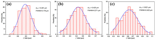 The SEM secondary electrons (SE) morphology of γ′ reprecipitation after solution treatment under different cooling rates is displayed in Figure 3. The reprecipitated γ′ phase was uniformly distributed overall and embedded in the γ matrix channel. Nevertheless, the microstructure and size of the γ′ phase was significantly affected by the cooling conditions. With the decrease in cooling rate, the size of γ′ phase was bigger. After being cooled down by WQ and AC, the size of secondary γ′ precipitate was measured to have the statistical mean diameters of 0.359 and 0.491 μm, respectively, as shown in Figure 4a,b. Meanwhile, the γ-channel was transformed from a serrated to a straight one with the increasing the cooling rate. This came from the result of the growth of the γ′ phase and the increased coherent strain energy. It is not unnoticeable that the lower the cooling rate is, the relatively larger the area fraction of γ′ phase, which increased from 75.6% for the WQ sample to 79.7% for the AC sample. The detailed statistics analyses are presented in Table 3. It can be assumed that the lower cooling rate provided for the precipitation and growth of the γ′ phase. The cooling process after solution treatment was equivalent to undergoing a transient aging treatment, and this is more clearly confirmed by comparing the results of the HT samples, as seen in Figure 3c. After two-step aging treatment, the size of the γ′ phase grew to 0.621 μm and its area fraction reached 82.3%, as listed in Table 3. However, the number density of the γ′ phase for the HT sample was about 6.4/μm2, which was much lower than that of 12.7/μm2 under the WQ cooling condition. Under slow-cooling conditions, the number density of γ′ phase is lower. This leads to a decrease in the total coherent strain energy and results in a coarsening of the γ′ phase [7]. Indeed, the secondary γ′ precipitates are transformed from sphere to cube with the slow-cooling rate [25].