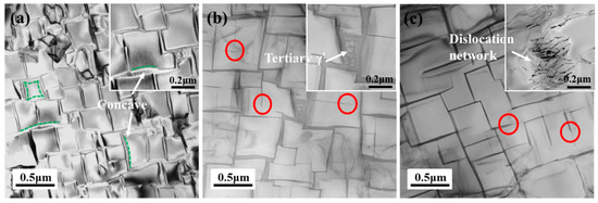 The microstructure of γ′ phases under different cooling conditions are shown in Figure 5. It is found that the finer γ′ phases are distributed orderly under WQ cooling condition, and the four sides are concave, as marked with a green dashed line in Figure 5a. This is due to the fact that the γ′ phase particles have the smallest elastic modulus along the [001] orientation; it will preferentially grow along the direction of body diagonals under the interaction of coherent strain. Meanwhile, the growth of cube corners will be enhanced due to the larger potential rate of supply of solute to these regions [30]. These γ′ phases are unstable, and as adjacent γ′ precipitates grow and collide with each other, the concave edges tend to be straightened due to the coherent strain energy [31]. In contrast, when the cooling condition is AC, a large number of polygonal shape γ′ phase exist. Some vanishing γ-channels were located in the γ′ phase, which indicates that the growth of γ′ precipitates itself by merging adjacent to each other. In addition, the tertiary γ′ phases appeared in the γ-channel of the AC sample with a size of about 30~55 nm. After examining the composition of the tertiary γ′ phase, it is found that its Al, Ta content was lower compared with the secondary γ′ phase, but its Mo and Re contents were higher. It typically results that multiple nucleation events occurred at different undercooling degrees below the γ′ solvus due to a complex interaction between the increasing thermodynamic driving force of nucleation. This results from the temperature drop (increased undercooling) and the decreasing diffusivity of alloying elements and previous nucleation events resulting in a decrease in this driving force; this is similar to the results reported by Singh [27]. Surprisingly, for the HT sample, aside from the further coarsening of the γ′ precipitates, a dislocation network was found to be formed at the γ–γ′ interface. This is most likely due to a high amount of Mo and Re addition, causing a large lattice misfit. Even the spontaneous formation of dislocation networks to relaxing the interfacial misfit stress without an external stress.