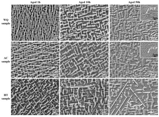 Figure 7 illustrates the microstructure of γ′ and γ-phases in the alloy after different heat treatment during thermal exposure at 1100 °C for 1 h, 10 h and 50 h. With the prolonged thermal exposure time, the γ′ phase underwent undirected coarsening and the morphology transforms from cubic to irregular. It can be seen that the γ′ precipitates are uniformly distributed, and their morphology remains mostly cubic after 1 h of thermal exposure in the WQ and AC samples. However, at the same time, the γ′ phase in the HT samples clearly underwent an undirected coarsening, forming irregular shapes by merging with each other. When thermally exposed for over 10 h, the γ′ of the WQ and AC samples also gradually coarsened and lost its cubic shape. However, for the HT samples, it precipitated the TCP phase which surrounded by the γ′ envelope. Subsequently, the γ′ precipitates continued to coarsen and topological inversion was observed after 50 h of thermal exposure for all samples.