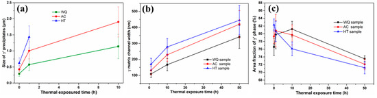 The size of γ′ precipitates as a function of time is plotted in Figure 8a. It should be noted that the size of γ′ precipitates is not measurable after 50 h of thermal exposure due to the “labyrinth-like” shape. It can be seen that the size of the γ′ phase increased rapidly at first and then slowed down with the prolongation of the thermal exposure time. This was probably because the interfacial area and lattice mismatch strain of γ/γ′ phase, which is the thermodynamic driving force for the coarsening of the γ′ phase, was gradually consumed, so that the coarsening rate gradually decreased. Secondly, the WQ sample had the smallest γ′ phase size after thermal exposure for the same time, which can be explained by comparing the lower dominant coherent strain of γ/γ′ phase of the WQ sample to the other samples; in addition, during the coarsening process, more Re with low diffusion coefficients was repelled from the γ′ phase, which was beneficial to delaying the coarsening rate. Meanwhile, the coarsening of the γ′ phase broadened the spacing of the γ matrix, and the γ matrix width of the WQ sample increased the least, as shown in Figure 8b. In addition, no significant tertiary γ′ phase was found in the γ-channels of all samples after 50 h of long-term thermal exposure, which means that the tertiary γ′ phase was dissolved back into the γ matrix as the γ-phase became coarsened and the elemental saturation decreased. After the long-term thermal exposure of 50 h, the area fraction of γ′ phase decreased and tended to be consistent for all samples, as shown in Figure 8c. However, at the initial stage of thermal exposure, both WQ and AC samples showed a transient increase in their γ′ phase area fraction rather than a single decrease for HT sample. This is because the initial stage of the thermal exposure process is similar to the aging process and allowed the γ′ phase to grow and reach the maximum area fraction.