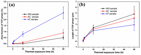 Area fraction (a) and length (b) of TCP phases of samples after different thermal exposure times.