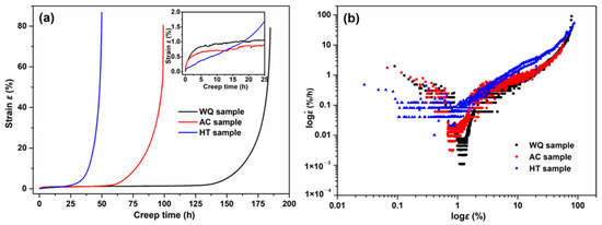 (a) Creep strain–time curves (The inset shows the primary stage of creep); (b) strain rate with respect to strain of the different heat treatment sample at 1100 °C/137 MPa.