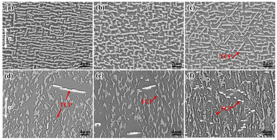 Ni-based single crystal (SX) superalloys are extensively used for modern areo-engines due to their excellent microstructural stability, mechanical properties and environmental tolerance at elevated temperatures [1,2]. Generally, the excellent mechanical properties of Ni-based SX superalloys at elevated temperature derives from their unique two-phase equilibrium microstructure, consisting of ordered Ni3Al (γ′ phase)-strengthening precipitates with an L12 structure, which are coherently embedded in the face-centered cubic (FCC) matrix γ-phase [3,4]. In addition, high temperature creep strength is a key parameter with which to evaluate the high mechanical properties of Ni-based SX superalloys, which depends on the interaction of dislocations with the γ′ precipitates and interface of γ/γ′ phases [5,6,7,8]. However, the γ–γ′ microstructure undergoes degradation during the prolonged high-temperature exposure, including coarsening of γ′ precipitates and precipitation of the topologically close-packed (TCP) phase [9,10,11], which makes the superalloy enter the rapid deformation stage and fracture. Although a proper initial γ–γ′ microstructure is obtained, it is necessary to consider slowing down the coarsening of γ′ precipitates and inhibiting the precipitation of TCP phase, which are very important for improving the high-temperature creep properties of the alloy.