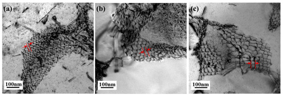 The dislocation network formed in samples interrupted by creep 1100 °C/137 MPa for 10 h: (a) WQ sample, (b) AC sample and (c) HT sample. (Beam = [001], the spacing of the dislocation network is marked by red arrows).