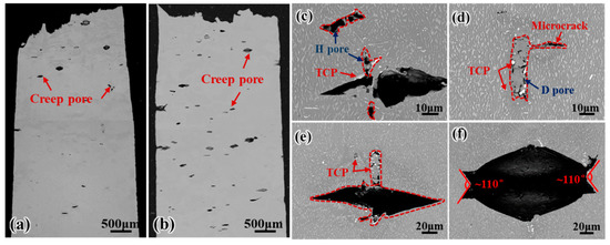 SEM micrographs of different samples ruptured after creep deformation at 1100 °C/137 MPa: (a) WQ sample, (b) HT sample, (c) TCP phases near homogenization pores, (d) TCP phases near the creep deformation pores and microcracks and (e,f) growth of pores and microcracks.