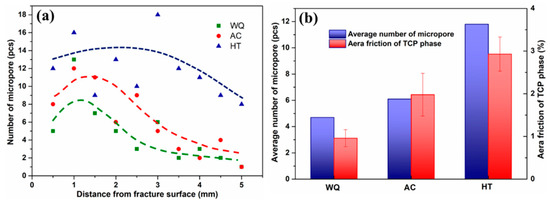 (a) number of micropores varies with the distance from the fracture surface and (b) histogram of average number of micropores and TCP phase area fraction.