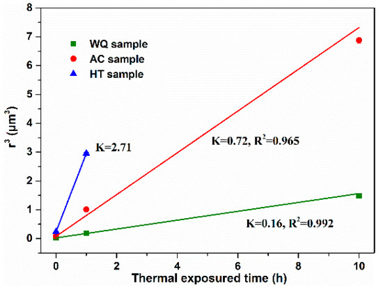 where is the average radius at the thermal exposure time t, is the average radius at t = 0, n is the temporal exponent and K is coarsening rate constant. Accordingly, the coarsening rate constants of γ′ precipitates in experimental alloys are presented in Figure 17. Obviously, the experimental data appeared to match perfectly to the classical LSW model when n = 3 according to Equation (6) for all samples. The K values was 0.16 μm3/h for WQ sample were calculated by fitting the slopes of the line connected by these points, which was much lower than the values for the AC and HT samples. So, the γ′ coarsening rate was significantly reduced by increasing the cooling rate after ST.