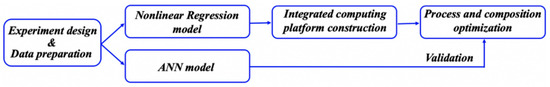 In recent decades, artificial neural networks (ANNs) and various regression methods have been powerful and flexible modeling tools that can lead to significant improvements in materials science, modeling complex problems and exploring the correlations between different materials’ properties [11,12,13,14]. Yang employed the ANN model with a backpropagation (BP) algorithm to explore correlations that exist between heat treatment processes and mechanical properties of A357 alloy [15]. Conduit developed an ANN to enable the prediction of individual materials properties both as a function of the composition and heat treatment routine [16]. In addition, linear and nonlinear regression models were applied to develop the input–output relationship in many casting processes [17,18]. Chen applied the nonlinear mathematical model to quantitatively analyze the effects of the heat treatment on Vickers hardness of the Al-Si-Mg alloy, and achieved the optimum heat treatment process using the sequential approximation optimization method [19]. Akhtar optimized process parameters in the turning of Aluminum Alloy 7075 using a Computer Numerical Control machine [20].