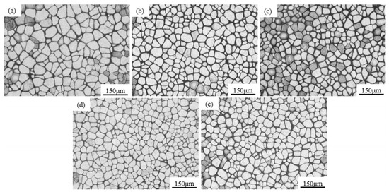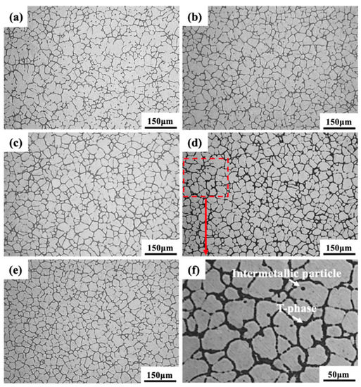 Optical micrographs of the as-cast ZE41-Ca-Sr alloys: (a) ZE41; (b) ZE41-0.2Ca; (c) ZE41-0.2Ca-0.1Sr; (d) ZE41-0.2Ca-0.2Sr; (e) ZE41-0.2Ca-0.4Sr [24].