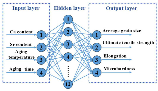 An ANN is a mathematical model consisting of many highly interconnected processing elements organized into layers. ANN keeps knowledge with connection weights [26]. Input signals are processed in the course of the hidden layer, and the following outputs are computed in the output layer. Input–output pairs are presented to the ANN and weights are adjusted to minimize the error between the predicted output and actual value. The multilayered neural network (MLP) is utilized to establish an ANN model, which is used to predict the microstructure and mechanical properties of ZE41-xCa-ySr alloys. Since the Back Propagation (BP) algorithm is a representative method used to reduce the errors created by the gradient descent method, it is used to train the multilayer feed forward network. A three-layered ANN model is developed using the MATLAB R2018a. Figure 4 shows the network configuration of the ANN model. As it seen in Figure 2, the network structure includes three layers: an input layer (four neurons), one hidden layer and an output layer (four neurons). The input variables consist of Ca, Sr content, aging temperature (Ta) and aging time (ta). The outputs correspond to average grain size (D), ultimate tensile strength (UTS), elongation (El.) and microhardness (HV). The dataset has been generated from a series of experiments on samples, as discussed in Section 2.1, which are listed in Appendix A. In order to avoid overfitting in the ANN training, 120 groups of data are divided randomly into three subsets: 70% training set, 15% testing set and 15% validation set. Both input variables and output variables are fed into the neural network toolbox.