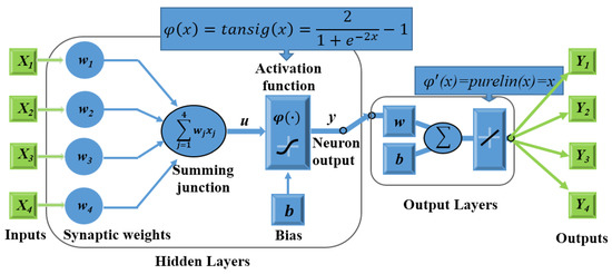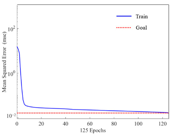 The ANN model training parameters are presented in Table 2. Based on the training parameters, the mathematical model of the ANN is shown in Figure 5. The data are normalized to reduce the order of magnitude difference between the various dimensions [27]. As activation transfer functions, the hyperbolic tangent “tan-sigmoid” function and the linear transfer function “Purelin” are used. Compared with the standard gradient descent algorithm, the Levenberg–Marquardt (LM) algorithm possesses fast convergence and a small mean square error [26]. As a result, a BP neural network with LM algorithm is adopted to train the ANN model. In addition, the number of hidden neurons is estimated according to the empirical formula: