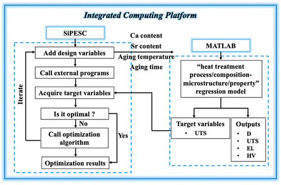 In this work, the optimization calculation of composition and heat treatment processes for the ZE41-xCa-ySr alloy gearbox casting is implemented using the Integrated Computing Platform. Integrated Computing Platform batch calls MATLAB, achieving the optimization calculation of “heat treatment process/composition—microstructure/property” for the gearbox casting. However, before that, developed regression models need to be compiled into a “m.” script file for MATLAB. Figure 6 presents the architecture diagram showing “heat treatment process/composition-microstructure/property” integrated computing system. The optimization calculation of heat treatment and composition parameters for ZE41-xCa-ySr alloy gearbox casting involves the following steps: