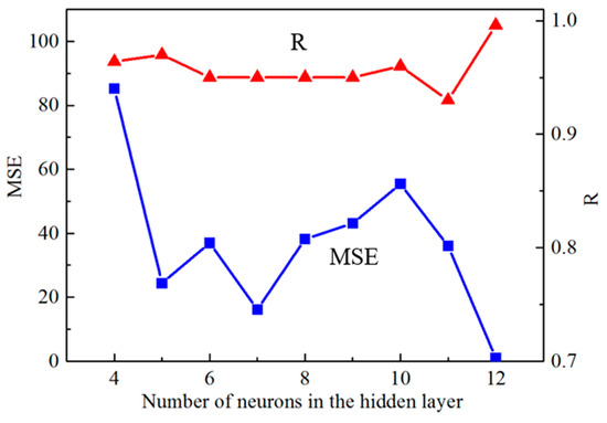 where m and n are the number of neurons in the input and output layers, respectively, and a is a constant in the range of 1 to 10 [28,29]. According to the empirical formula, nine kinds of ANN architectures with different neurons in the hidden layer are tested to determine the optimal one. The correlation coefficient (R) is used to evaluate the linear correlation between the experimental and predicted results. However, it is unable to evaluate when the prediction is biased towards a local scope. Therefore, mean squared error (MSE) is also adopted to evaluate the ANN performance. The corresponding functions are as follows: